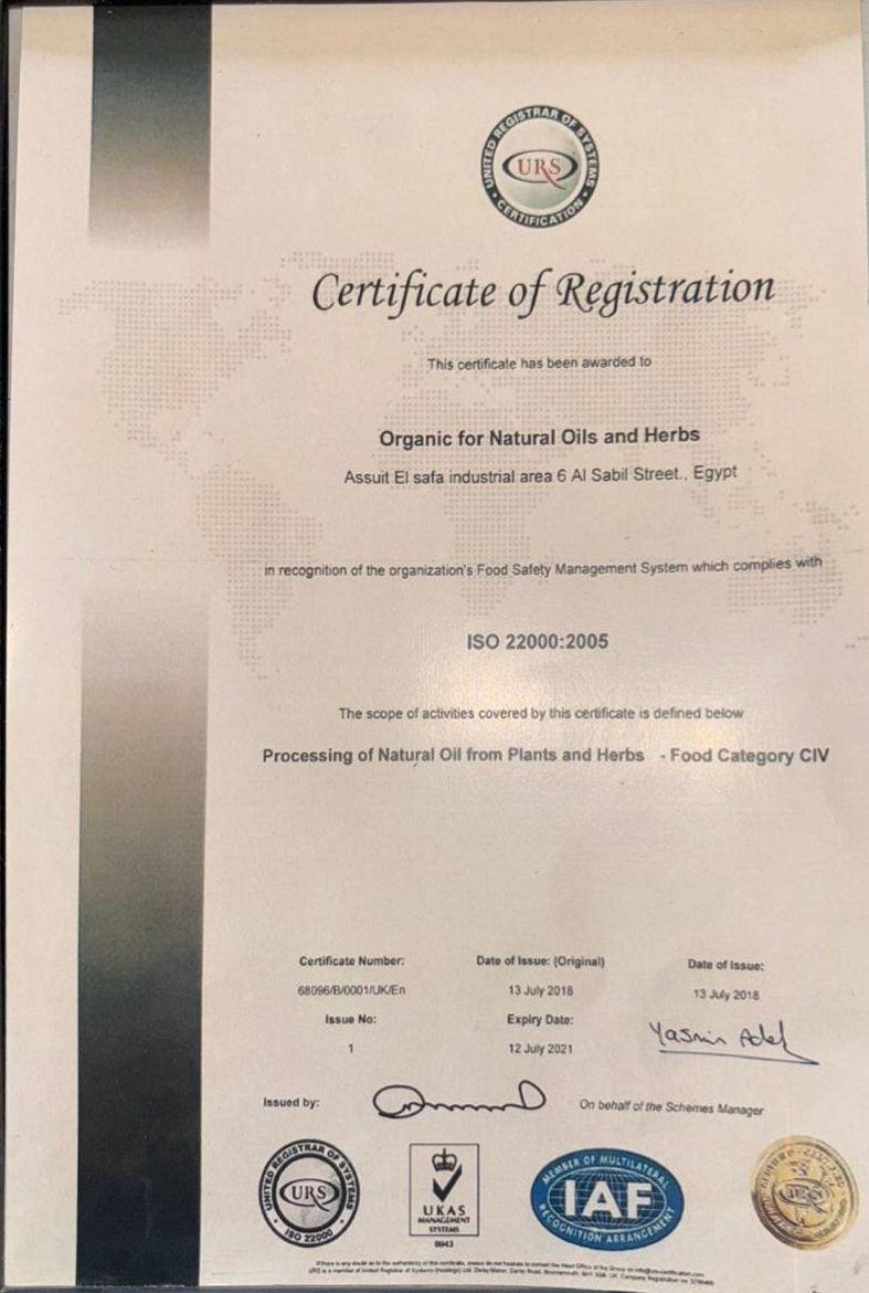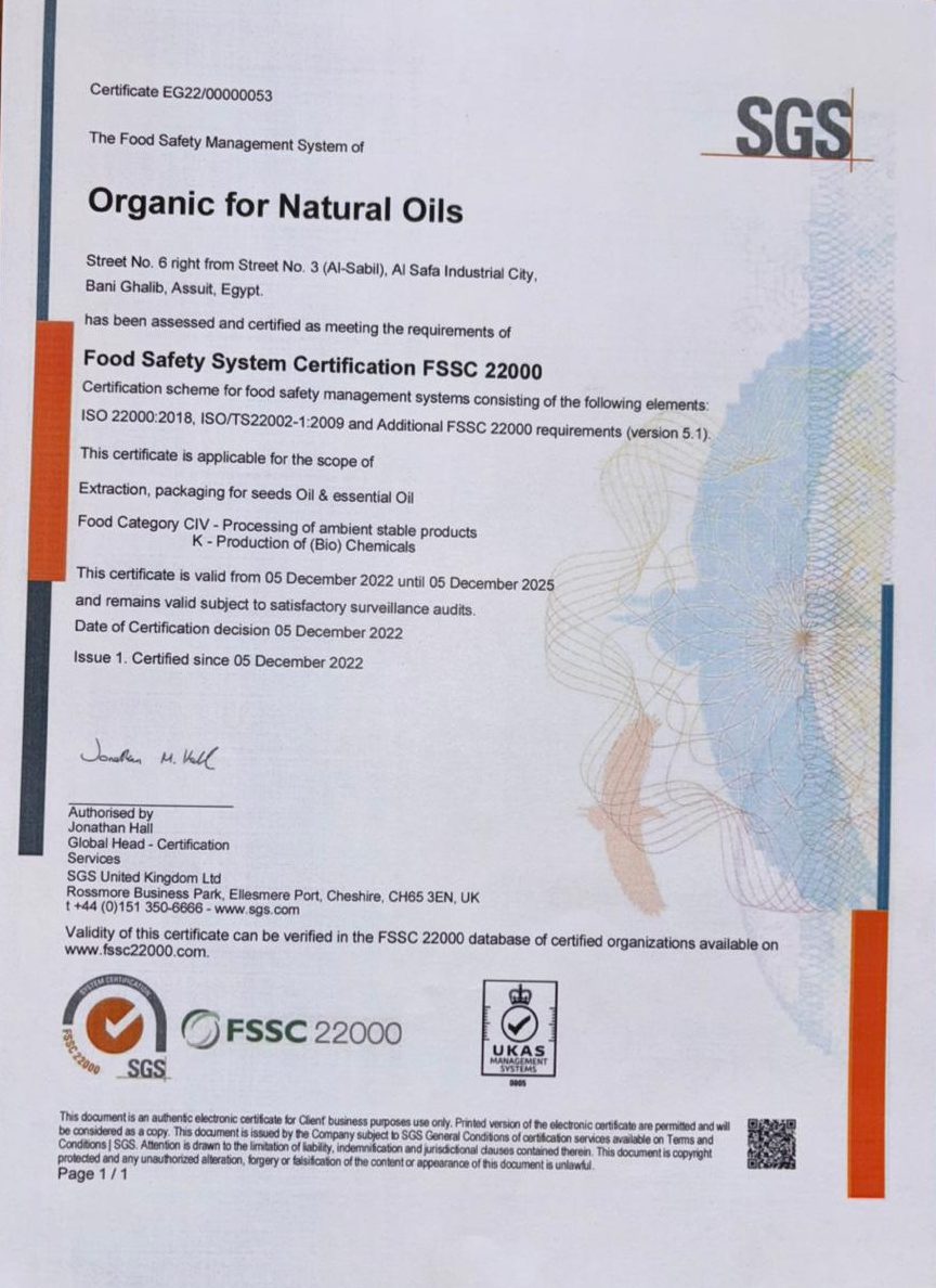 Certified by SGS United Kingdom Ltd, this globally recognized certification ensures that Organic for Natural Oils meets the highest international standards in food safety and quality for the extraction and packaging of seed and essential oils.